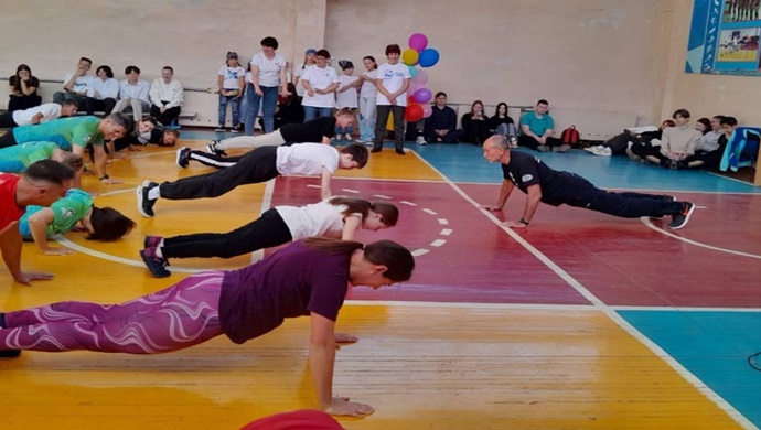 12 No’lu okuldaki çocuklar ve ebeveynleri , Amur bölgesel şirketi “Kyokushinkai-Kan” başkanı, milletvekili “Çocuk Sporları” parti projesinin bölge koordinatörünün rehberliğinde çömelmeyi, şınav çekmeyi ve doğru nefes almayı öğrendiler. yasama meclisi Anatoly Fesenko .