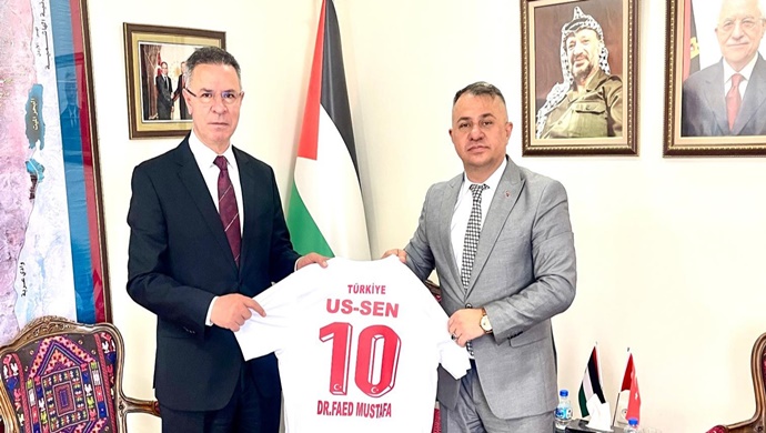 Uluslararası Sporcu Sendikası (US-SEN) Genel Başkanı Bekir Ayaz, Filistin’in Ankara Büyükelçiliğini ziyaret ederek Büyükelçi Dr.
