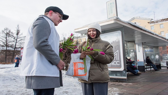 Kemerovo’da Birleşik Rusya Genç Muhafızları gönüllüleri, Sovetski Caddesi ve Nogradskaya Caddesi’nde 200’den fazla kız ve kadını tebrik etti ve her birine lale verdi.